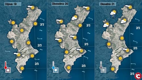 La semana avançarà sense intenció de portar-nos canvis. Dijous farà mes calor al sud que al nord. A la mirad sud de la Comunitat el ponent es deixarà sentir unes hores deixant de nou un dia de molta calor. En bufar el xaloc de nou a partir de divendres augmentarà de nou la sensació de basca però les temperatures quedaran un poc més curtes.