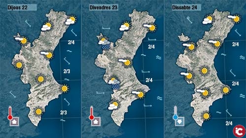 Demà dimecres haurem de tindre paciència amb el vent perquè no deixarà de bufar fins ben entrada la vesprada. Al cel només vorem quatre núvols decoratius, un poc més abunfants al nord. La nit serà freda i al centre del dia notarem com pugen un poc les temperatures.
