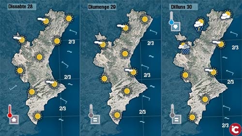 De cara a demà i al cap de setmana ens agradaria anunciar canvis (que és el que ens demaneu la majoria) i pot ser si refrescara un poc tots estariem més o menys d’acord. No obstant, la realitat ens parla d’un cap de setmana molt calorós on tindrem que recòrrer als llocs de la casa més frescos i a una bona hidratació per passar-la el millor que puguem. I qui puga haura de fer moltes hores de piscina i platja.