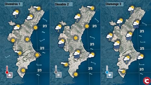 Tot indica que hui la pluja serà més intensa al nord i per linterior on des de primera hora haurem de seguir de ben aprop les núvolades que vagen formant-se. Al centre i cap al sud ens espera un dia mes assolellat, amb vent fluixos de ponent i temperatures més altes.