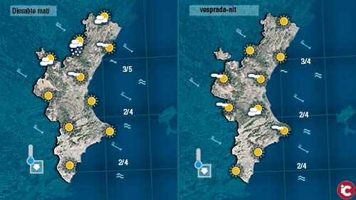 A més tindrem el cel més ennuvolat. Un front, no massa actiu, ens creuarà de nord a sud deixant ruixats dèbils (segurament inapreciables) de matí a Castelló, a partir de migdia al centre i de vesprada al sud. Precipitacions que seran en forma de neu a cotes prou baixes. Llàstima que seran anecdòtiques.