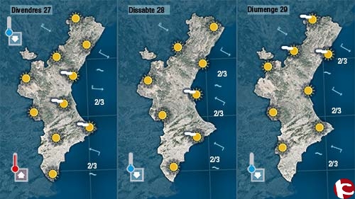 Divendres noteram un lleuger descens de les temperatures al nord on el vent de mestral farà baixar les temperatures un parell de graus, però al centre i al sud si es deixa sentir el ponent (encara que siga fins a migdia) encara pujaran un poc més les temperatures.