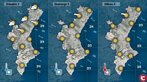 El cap de setmana serà assolellat però molt fred. Dissabte encara es deixarà sentir el mestral que accentuarà la sensació de fred per tot arreu. Diumenge i dilluns en encalmar el vent i tindre laire fred encara sobre nosaltres ens tocarà patir per la possibilitat de gelades a bona part de la Comunitat. temperatures negatives que podran tocar la mateixa línia de costa.