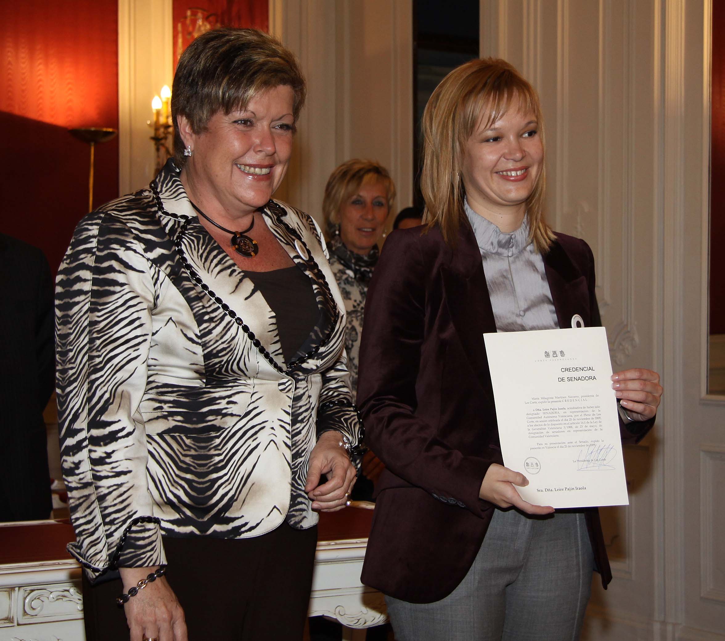La presidenta de Les Corts Valencianes, Milagrosa Martínez, ha entregado la credencial de senadora a la miembro del grupo parlamentario socialista Leire Pajín en un acto que se ha celebrado en el Salón de los Espejos del Palau dels Borja.