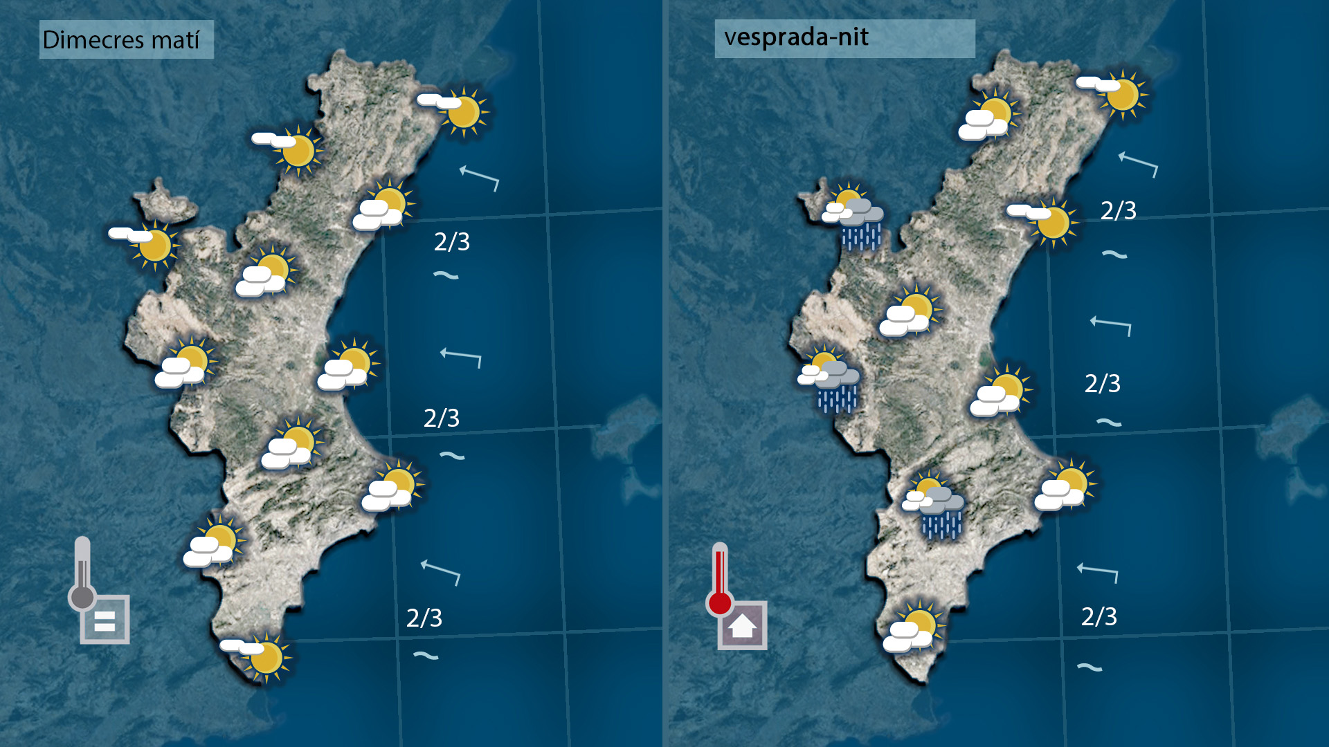 El dia serà més clar demà dijous. Sense estar clar del tot el cel la calitja s’esvairà un poc i els núvols seran memys compactes i potser farà menys calor per la nit però farà tanta calor com hui al cengtre del dia