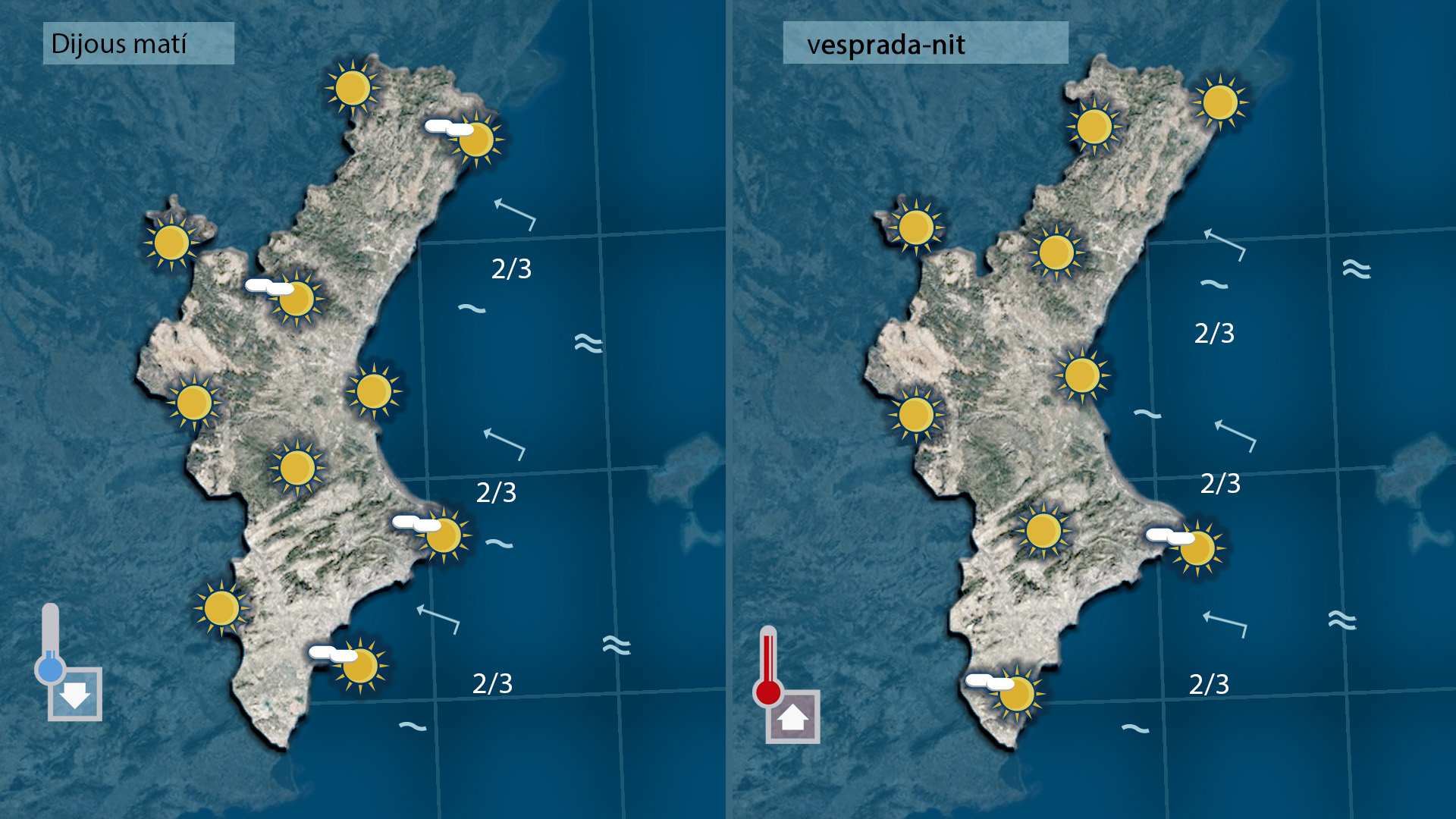 Demà divendres tindrem pas de núvols alts a partir d emig matí o de migdia acompanyant el vent de ponent i de llebeig que cap a última hora del dia bufarà moderat i començarà afer-nos patir en notar com guanya força amb l’arribada de la nit i els monuments fallers per a rematar de plantar.