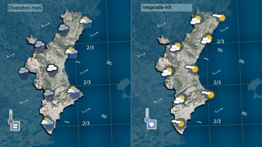 Demà divendres ens creuarà un front durant el matí deixanmt pluges i fent moure el llebeig. Les temperatures pujaran un poc per la nit i baixaran un poc al centre del dia.