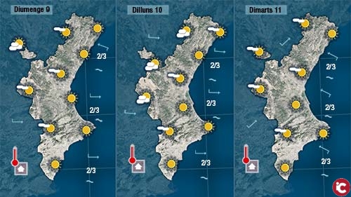 Esta nit han pujat lleugerament les mínimes i les màximes quedaran més o menys en els valors d’ahir. Tindrem pas de núvols que seran més abudants durant el matí que esta vesprada.