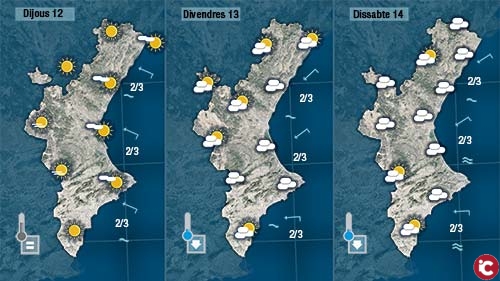 Dijous no sesperen canvis però divendres i dissabte sembla que vorem poc el sol. El vent de gregal i llevant acumularà núvols baixos a la costa i al prelitoral on de es descarta que puga arribar a ploure dèbilment. No obstant sembla que de moment no cal alarmar-se perquè la probabilitat de pluja de moment és molt baixa.