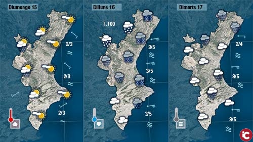 Els termòmetres patiran hui una sensible baixada, notable en zones del nord i linterior on poden quedar més de 10 graus per davll de les dahir. Tindrem més núvols i fins i tot cal esperar ruixats dèbils i esporàdics (de moment res important).