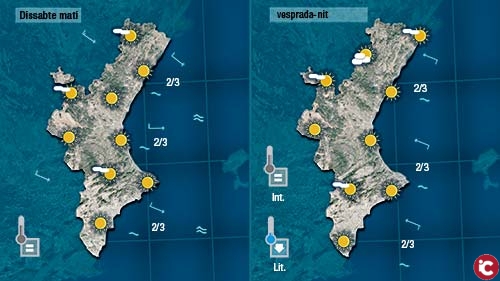 Fins a mig matí s´alternaran els núvols i els clars, i fins i tot podrà ploure a rogles (sempre amb més probabilitat al nord i per l´interior) però no tardarà en escampar la nuvolositat, en imposar-se el sol, i tampoc tardarem molt en notar l´ascens de les temperatures que s´acostaran al 30 graus al centre i a la costa.