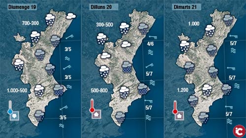 Diumenge la pluja sembla que serà prou general (encara que en estes situacions de gregal sempre plou més al sud de València i al nord d’Alacant), i la cota de neu anirà baixant de forma progressiva durant la vesprada-nit de diumenge i durant la matinada de dilluns.