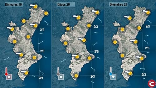 Comencem la setmana amb menys núvols al cel i les temperatures experimentaran un ascens notable respecte els valors dahir diumenge. El mercuri dels termòmetres pujarà més al centre i per linterior perquè a la costa el vent de xaloc i llevant encara refresca lambient en esta època de lany.