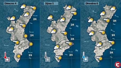 Loratge de hui destacarà per la seua variabilitat. Continaurà bufant el ponent. Les temperatures seran suaus però tendiran a baixar de forma notable a partir de la vesprada i es regstraran ruixats dèbils al nord i per linterior que ales zones més altes de Castelló i del nord de València podran deixar volves de neu per damunt dels 1.200 metres recordant-nos que encara estem a lhivern.