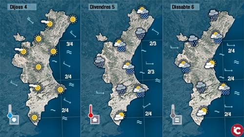 Els núvols avançaran cap al sud al llarg de la vesprada, i a poqueta nit, en girar el vent a gregal al sud podria ploure en punts de la costa de València i del nord d’Alacant. Un descens de les temperatures acompanyarà al pas de núvols de nord a sud.