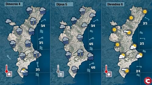Pensem que les precipitacuons començaran a descarregar durant el matí en punts de la costa. De vesprada les pluges es faran més generals i localment podran descarregar amb intensitat moderada o forta a la costa de València i a la dAlacant. El descens de les temperatures serà notable (de vora 5 graus)