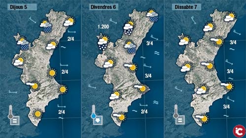 Demà toca pujar,. Ho faran tant a les mínimes com a les màximes. El mercuri dels termòmetres no baixarà dels 15 graus a la costa i superarà els 25 al centre del dia. Per l’interior no baicxaran dels 5 per la nit i s’acostaran als 20 a migdia.