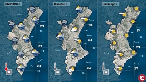Divendres torna la pluja. Arriba des de linterior, de la mà dun front que ens creuarà des de linterior cap a la costa. Són fronts que habitualment no deixen precipitacions importants però actualment els mapes donen pluja a tota la Comunitat abans dacabar el dia (sempre seran més probables a linterior que a la costa).