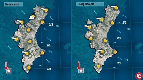 Demà dimarts pujaran tant mínimes com màximes. El vent bufarà fluix de mestral al nord i de xaloc al centre i al sud. Els termòmetres tocaran o saproximaran als 20 graus a les hores centrals del dia a molts observatoris.