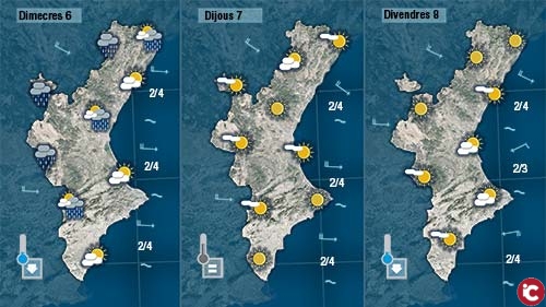 Han pujat les mínimes esta nit i les màximes quedaran tan altes com les d’ahir (pot ser baixen lleugerament en punt de l’interior on el cel estarà un poc més cobert) i pugen al litoral d’Alacant (on el ponent es deixarà sentir més que ahir)