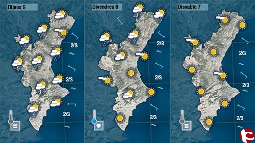 Una vegada passe la línia dinestabilitat el vent bufarà de mestral al nord on de vesprada encara podria registrar-se algun ruixat. Les temperatures experimentaran una sensible baixada divendres però durant el cap de setmana tornaran a recuperar-se.