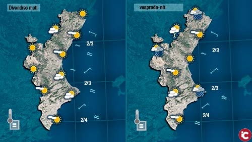 Demà divendres podem apuntar xicotets canvi. El dia serà assolelat tot i la presència de núvols baixos al litoral a primera hora, però de vesprada caldrà estar atents als núvols que puguen créixer a les muntanyes del nord perquè les tronades podrien cobrar protagonisme.