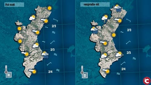 Hui tindrem més núvols que ahir i pot ser baixen un poc les temperatures al centre del dia però no cal esperar canvis importants. Durant el matí vorem més núvols a la costa on fins i tot podria escapar-se alguna gota. A migdia començaran a formar-se nuvolades a les muntanyes del nord que localment podrien donar ruixats i alguna tronada.