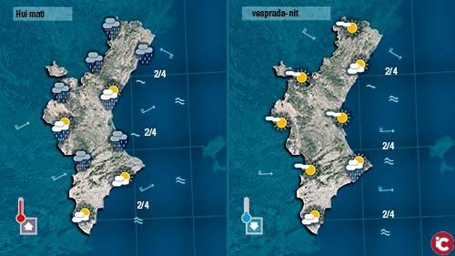 Cal esperar precipitacions dèbils fins a migdia o primera hora de la vesprada quan s’imposarà el ponent fent còrrer els núvols cap a la mar. Les tempesratures mínimes, en estra el cel més ennuvolat, han pujat i les màximes baixaran lleugerament.