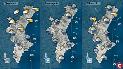 De confirmar-se les previsions dilluns també serà un dia marcat per la pluja amb precipitacions més probables a la costa i a la mitad sud de la Comunitat. Tot indica que de vesprada els núvols començarien a escampar de nord a sud.
