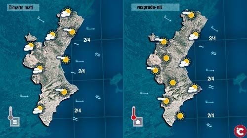 Demà dimecres el ponent també es deixarà sentir (sense bufar massa fort) deixant les temperatures dos o tres graus més altes. Darà córrer els núvols de ponent a llevant i només de forma puntual podria ploure dèbilment al nord i per l’interior.