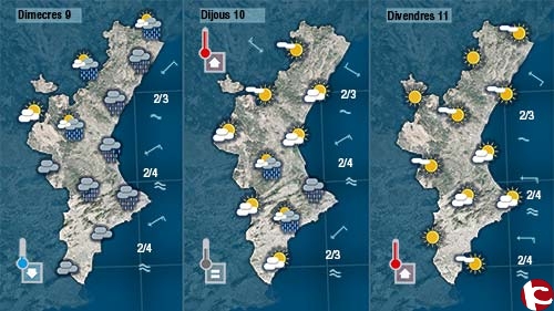 Dijous els núvols escamparan de nord a sud, i només al sud de València i al nord dAlacant podria ploure amb un poc de trellat fins a migdia.