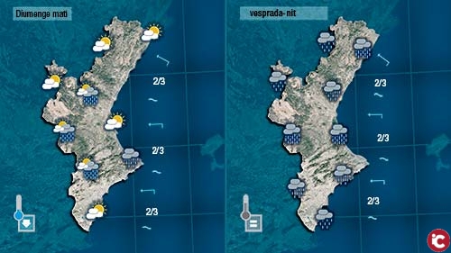 Demà dissabte els núvols avançaran de sud a nord portant precipitacions a la major part de la Comunitat abans dacabar-se el dia. Pluges que localment podran ser moderades i persistents de vesprada. Pot ser durant la nit i matinada escampe un poc i fins i tot deixe de ploure.