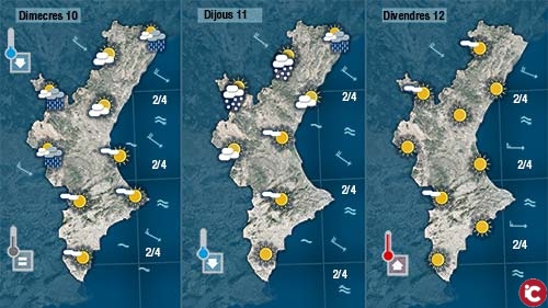 Dimecres i dijous bufarà un poc travessat de mestral deixant més baixes les temperatures. De fet, la matinada de dimecres a dijous podrien quadar enfarinades les muntanyes del nord de la Comunitat per damunt dels 1.000 metres.