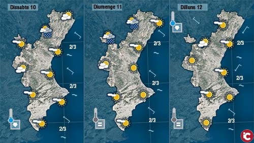 Dissabte tindrem núvols mitjans i alts per tot arreu, i les temperatures més altes (en punts del centre i de linterior de la mitad sud) tocaran els 35 o els 36 graus, però en girar el vent a xaloc (sud-est) també pujarà la humitat.