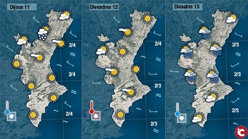 A partir de dijous sembla que bufarà un dia mestral i l’altre ponent. El dia que bufe del nord-oest baixaran les temperatures i el que ho faça de ponent quedaran un poc més altes. De pluja poca en podem esperar. Tan sols algun ruixat dissabte.