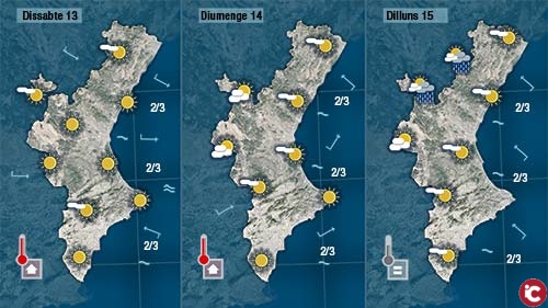 De matí tindrem intervals de núvols mitjans i alts al nord on el vent encara es deixarà sentir de mestral. Al centre i al sud bufarà més fluix i fins i tot encalmarà deixant pas a les brises a la costa de València i dAlacant. Les temperatures diürnes pujaran un poc.