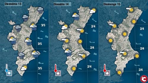 Divendres tornarem a tindre un oratge molt variable i de nou més fred. Els núvols i els clars alternaran al cel des de primera hora del dia amb ruixats que de matí semblen més problables al nord i de vesprada al sud.