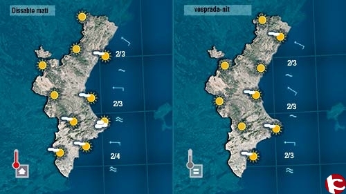 Demà dissabte no espere grans canvis. Pot ser pugen un poc les temperatures nocturnes però les diürnes quedaran en valors semblants als de hui. Al cel quatre núvols decoratius, més abundants a la costa a primera i última hora del dia.
