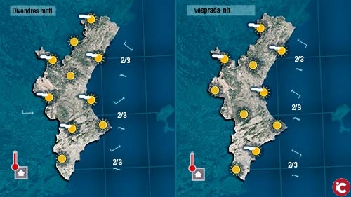 Demà divendres encetem un nou llarg cap de setmana que vindrà marcat per lestabilitat i les altes temperatures. Al cel només alguns núvols decoratius i als termòmeres valors aprop o tocant els 30 graus. Fins a migdia el vent bufarà fuix de component oest, girant a xaloc (sud-est) de vesprada.