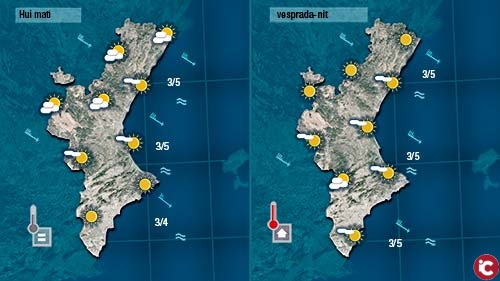 Demà bufarà més fresc i més fort. Serà a última hora del dia i de cara a la matinada quan bufe amb més gana. La nuvolositat serà més abundant per linterior on no es descarta que puga ploure dèbilment