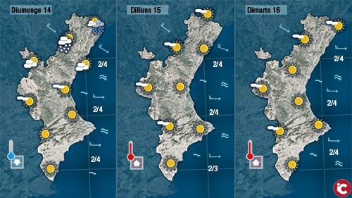 Demà dissabte començarem el cap de setmana amb sol i amb temperatures que presentaran pocs canvis. Durant el matí el vent bufarà fluix de llebeig i tindrem núvols alts que anunciaran larribada duun front que de vesprada i sobretot a poqueta nit deixaran el cel més ennuvolat i pot ser algun ruixat al nord, amb una cota de neu duns 1.000 metres.