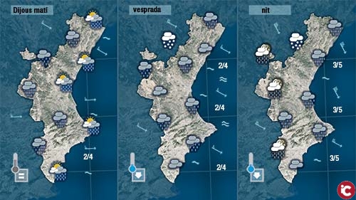 Les precipitacions seran més probables i intenses al nord i per linterior però caldrà esparar fins a migdia per vore si tanbé plou amb trellat a la costa.