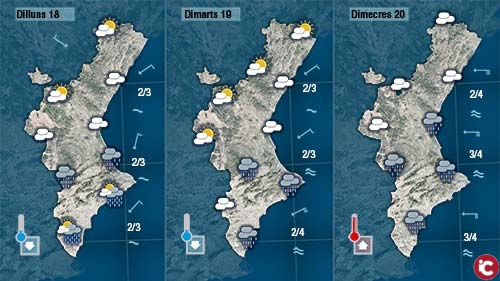 Divendres i dissabte seran dies de sol i de calor. El vent es deixarà sentir fluix de ponent i de llebeig mantenint l’ambient calorós. Sembla que diumenge començaran a baixar les temperatures de nord a sud al temps que augmenta la nuvolositat.