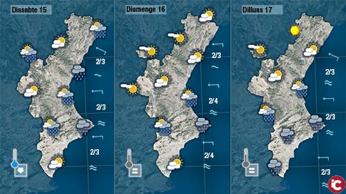Només de forma puntual podrà ploure en punts del litoral i prelitoral del sud de València i del nord dAlacant. Ruixats dèbils que només tindran opció fins a migdia perquè de vesprada acabarà imposant-se el sol.