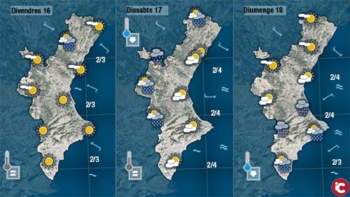 Demà dijous encara es deixarà sentir durant tot el dia i a bona part de la Comunitat, però bufarà més fluix i fins podrà deixar pas a les brises a migdia a la costa, on les temperatures no patiran grans canvis, però encara podran plujar dos o tres graus per linterior, situant-se pròximes al 18 o 19 graus.