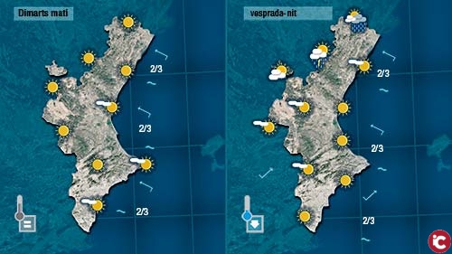 Demà dimarts només haurem destar atents als núvols de tempesta que segurament es formaran de vesprada al nord, a les muntanyes de Castelló. Les temperatures no patiran grans canvis per la nit i baixaran lleugeramental litoral de vesprada.