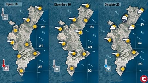 Dijous encara notarem el mestral al nord mentre que al centre i al sud acabarà bufant del sud-est. Les temperatures mostraran un comportament desigual en funció de la direcció del vent. Pujaran menys allà on el vent siga dorigen marítim. Divendres serà un dia calcat al dijous. Dissabte cal esperar de nou un dia ventós i més fresc amb alguna gota al nord que en altures supriors als 1.000 metres serien de neu.