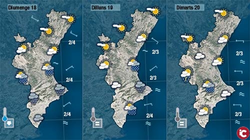 Diumenge tornarà a concentrar-se linestabilitat, els núvols i la pluja a la mitad sud de la Comunitat on es vora poc o no gens el sol i on les pluges podran ser localment moderades. Dilluns i dimarts no tenim massa clara la previsió perquè a dia de hui els models continuen marcant certa inestabilitat que pot ser no done pluges ni massa generals ni quantioses però ens mantindrà molt pendents de levolució de les previsions al llarg del cap de setmana.