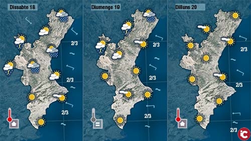 Dissabte i diumenge encara quedaran restes d’inestabilitat suficients com per donar algun ruixat aïllat i tempestes de vesprada però l’oratge serà més estable i les temperatures mostraran una clara tendència a recuperar-se