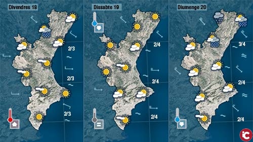 Entre divendres i dissabte ens creuarà una franja de núvols de norda sud però només de forma puntual, anecdòtica podrien deixar alguna gota. Les temperatures pujaran divendres amb l’ajuda del ponent i baixaran lleugerament dissabte.